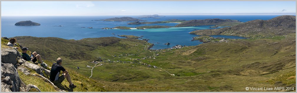 Looking towards the southernmost tip of the Western Isles, including the islands of Vatersay, Sandray, Pabbay, Mingulay and Berneray.Get this image from alamy